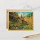 Vintage Texas Save The Date postcard in fun retro mid-century style. It features a rustic woody nature landscape with a wood cabin and water wheel mill, and a pretty creek stream with fall leaves for an autumn or end of summer feel. This Texas Save The Date postcard will be perfect for a country wedding or nature and camping wedding.