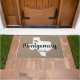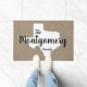 Classy hand lettered family name in black doormat with a faux burlap background and black state of Texas silhouette in white.