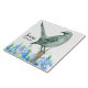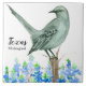 A ceramic tile decorated with a grey mockingbird on a post with blooming bluebonnet wildflowers drawn with ink and painted with watercolor. Inspired by the state bird and state flower of Texas.
