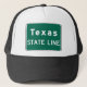 Green and white road sign for "Texas State Line" can be seen on Texas state highways and biways.