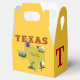 Outline of Texas with icons related to Texas,bird,alamo,"longhorn steer",flower,gold done on a gold background