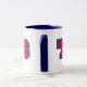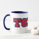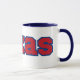This custom coffee mug features a design that displays the word "Texas" in a Sports World print font with red letters blue outline in this custom state pride style and theme. The rim & handle are glazed in matching colours available in 11-ounce or 15-ounce sizes microwave and dishwasher safe ceramic construction.