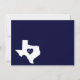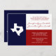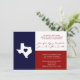 A simple state of Texas themed wedding invitation with a Texas state silhouette with a heart in the middle, like you would normally see the Texas star. The wedding invitation has the state flag colours of red, white, and blue. The backside of the invitation is blue, with a white Texas state silhouette with the heart. These Texas wedding invitations are perfect for any couples who show great pride in the great state of Texas and are having a Texas themed wedding.