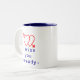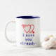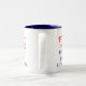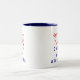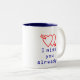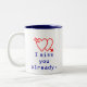 This is a blue, red and white ringer mug featuring the popular text 'I miss you already'. A great gift mug for someone you care about. The text is easily personalised to say anything you like easily. It also features two red hearts bound together with an arrow through it.