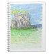 An illustration of a Thailand coastal scene is depicted with loose, expressive strokes, showcasing a rocky outcrop and the meeting of land and sea under a blue sky. Sparse vegetation sits atop the rocks, adding touches of green to the predominantly blue, green and beige tones.