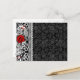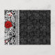 Thank Y0u Calveras Sugar Skull Postcard. Features a black n grey damask background with fancy flourishes on top of it. Black and white sugar skull on top for a cool, urban Day of the Dead look! Red roses for eyes