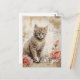A fluffy tabby kitten with striking blue eyes is sitting next to two pink roses against a backdrop featuring vintage script and ink blotches. The sepia tones give a warm antique feel to the composition, which combines florals and a cute animal subject.