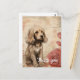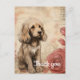 A golden brown puppy with fluffy fur is sitting quaintly next to a couple of large, stylised roses. The background features abstract beige tones with subtle floral outlines and script-like markings, giving a soft, vintage feel to the whole composition.
