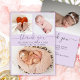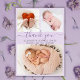 Baby Birth Lavender Lilac Announcement Thank You Photo Collage Cards. Elegant minimalist cute birth announcement featuring 3 of your favourite baby photos on front, with a pretty hand lettered text „thank you” in a swirly calligraphy script with swash tails on lavender or lilac colour background. Add your baby's name on the front and birth stats. On the back side there's space for your thank you message and one baby photo. You can easily personalise it.