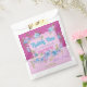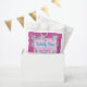 Beautiful birthday party "Thank You" favour bag with pink, blue and violet watercolor flowers, green swirls and piece of parchment for your text, over purple and baby pink background with white polka dots. Cute, colourful, girly design, perfect for spring/summer floral themed birthday celebration.