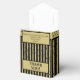The background is a simple stripes pattern with black and gold vertical stripes and confetti for an all-over geometric print. The design is suitable for all occasions, all ages, and all genders.