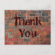 Thank You postcard Brick wall photograph. Grunge font. Postcard can be customised with your own message. Personalise with your own name and information. Customise and Personalise the text on this product for any occasion. Postcards are perfect for mass mailings or whenever you need to mail a large number of announcement or party invitations. Discounts available when purchased in bulk.
