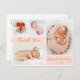 Modern, Girly Pink and Gold Thank You Baby Birth Announcement 4 Photo Collage Postcards. Elegant, cute photo birth announcement template featuring four (4) of your favourite baby photos with a pretty hand lettered script in gold on blush pink colour with a little peach colour accent colour blocks. Add your baby's name, thank you message and birth stats. Easily to personalise it.