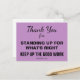Black text on pale purple background. Purple is the combination of red and blue, signifying working for the country. This colour also distinguishes these thank you postcards from the pink slip postcards sent on March 15.