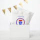 A fun and colourful 8th birthday party favour bag ready for your customised text. The circular design features a large red birthday banner with the message "HAPPY BIRTHDAY". Underneath, is a blue and red sports top, with a large white number 8 and space for the birthday child's name. Additional editable text in blue, top and bottom on the bag, reads "THANK YOU" "for coming to my party".