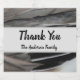 A photo of duck feathers adorns this personalised appreciation beer label creating horizontal stripes of feathers. The grey and black bird feathers add a touch of nature and a unique abstract element to this modern label. "Thank you" and your family's name appears inside a light grey banner. All text can easily be personalised.