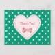 A cute thank you postcard with an emerald green polka dot pattern and a heart shaped patch stitched in pink, embellished with a pretty in pink ribbon. Flat printed image, not actual bow.