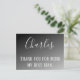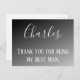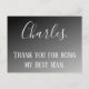 Show your best man how much you appreciated him on your big day with this "Thank you for being my Best Man" wedding thank you card. This customised thank you postcard features a black gradient design with his name written in large white cursive font. Underneath the name is "Thank You for Being My Best man" written in white standard print. Personalise your thank you postcard today!