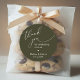 Modern Wedding minimalist "Thank You for celebrating with us" Cookies and Gifts Round Sticker, in romantic script, little heart, with bride and groom signature and wedding date, olive green theme wedding favors label.