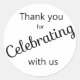 The Thank You for Celebrating with Us Sticker 1 features black text on a round sticker. These stickers are great for weddings and other celebrations. This design looks best on a round or square sticker. Choose the background colour you desire. Be sure to check out the Pink and Turquoise text versions of this sticker!