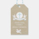 Add a personal touch to your party guests favours with this gift tag. It has a light tan textured background. There's a banner that reads "My First Communion" with doves on each side holding it with a light blue cross in the centre of a white circle. Personalise with name. You can customise the font style, colour, and style.
