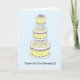 A multi tiered, pastel coloured wedding cake against a pastel blue background. The words 'Thank you for marrying us ' are under the image of the cake.