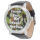 Watch with black leather strap, Camo design face with white letters "Thank You for your Service" gift idea for a current Military person or Veteran.