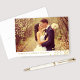 Elegant vintage inspired folded wedding thank you note cards feature an ornate decorative border design with a metallic champagne gold shimmer appearance, and custom monogram text and landscape wedding day photo that can be personalised on the front. The inside includes a custom message that can be printed or removed if you prefer a handwritten note.