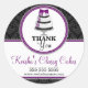 © 2014 Socialite Designs. Our elegant cake bakery box seals / stickers has a cake with swirls, flowers and a bow on top inside a lace circle. The background has a subtle damask pattern. Text includes thank you along with a business name and contact information.