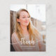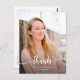 Thank you graduation design, for college or high school, featuring full bleed photo and the word "thanks", in modern script. Easily customise with your favourite pictures (front and back) and your text. Includes short message, at the back.