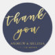 NewParkLane - Elegant wedding stickers, with 'Thank you' in elegant faux gold script typography, against a navy blue background. Easy to customise in Zazzle with your own names, date or other text for a personalised design. All text style, colours, sizes can be modified to fit your needs. You can alos change the background colour to fit your own wedding theme.