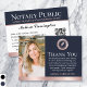 Custom thank you cards for your notary business — a friendly way to show your appreciation and invite future collaborations. This elegant design features your profile photo, a classic serif font, and a feather quill pen within a seal-shaped symbol. Personalise with your name, qualifications, services, contact information, and a personal message. A QR code is included on the back, encouraging customers to link to a review site and leave feedback. This template has fully customisable text to fit your business brand. Additionally, you can replace the seal motif with your logo. Perfect for a Notary Public, Loan Signing Agent, Certified Notary Trust Delivery Agent (CNTDA), Mobile Notary, Apostille or other legal professional. Printed colours: dark Midnight Blue (blue-black), black, white, and pink rose gold elements. Shop the online collection for more popular product ideas and supplies, designed for notaries!