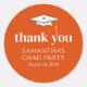 This design features a graduation label in orange and white, a thank you sticker, a simple minimalist, bold typography, a mortarboard grad hat, a party favour, and basic plain, modern, party decor.