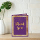 A chic and girly purple background color and a faux gold frame. With a golden confetti rain. On front a hand lettered style script and the text: Thank You! and a floral faux gold decor.