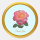 Cute thank you pink rose with golden frame on light blue round sticker. Text Thank you can be personalised.Ideal for wrapping gifts, as party supply, favour boxes and for everything else. A fine thank you detail everyone will love.