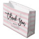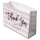 This modern and stylish, black and white retail shopping bag features the words "thank you" in trendy, handwritten script typography on a chic, blush pink watercolor stripe background. Add your business or company name and website or other info for a bag your corporate customers will want to show off.
