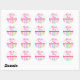 A round sticker with various colored stripes at the bottom divided by a bold pink stripe with dots on the top. In brown is written "Happy Birthday!". Colorful, but not too girly with the brown lettering. I think it is very coool.