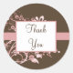Thank You stickers with a chocolate brown and pink floral swirl background. Get the matching postage to complete the look. Also available with monograms, or the names of the bride & groom.
