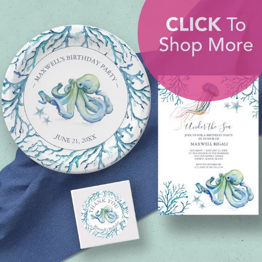 This whimsical birthday theme features a watercolor octopus with sea coral in shades of blue. Use the template fields to customise your thank you sticker with the birthday boy's name. A cute choice for kid's birthday parties. To see matching party decor visit www.zazzle.com/dotellabelle