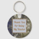 The background of this inexpensive teacher appreciation keychain features a swirled blue and gold abstract pattern that is elegant and eye-catching. A solid light blue and gold square is centred on this round keychain and provides the background for your words of appreciation. "Thank You For Being My Teacher" can easily be customised to suit your needs.