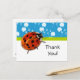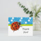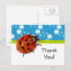 A thank you postcard with a trendy blue and white floral pattern, a green stripe, and a cute red spotted ladybug.