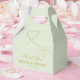 NewParkLane - Elegant personalised wedding favour box, with a two faux gold swirly hearts, against a sage green background.