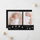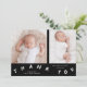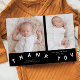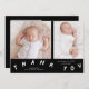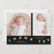 Whimsical birth announcement card featuring typography text that says "thank you" at the bottom with two photos on the font. You can add a 3rd picture on the back along with the birth stats and message. the background is black.