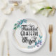 Thankful Grateful Blessed Paper Plates. When you see these paper plates, you'll be reminded of the power that comes from the name of Jesus. Christian or not, His name is a source of strength and hope. This balloon has a blue floral wreath and the words "Thankful Grateful Blessed." It's the perfect way to show your faith.