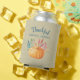 Can cooler with typography text which says: Thankful grateful blessed. perfect for the thanksgiving season. An image of an orange watercolor pumpkin with autumn leaves and sprigs.