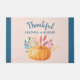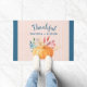 A doormat with typography text which says: Thankful grateful blessed. perfect for the thanksgiving season. An image of an orange watercolor pumpkin with autumn leaves and sprigs. Pink and gold striped pattern for the background.