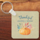 A keychain with typography text which says: Thankful grateful blessed. perfect for the thanksgiving season. An image of an orange watercolor pumpkin with autumn leaves and sprigs.