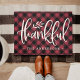 Personalised welcome mat in rustic red and black buffalo plaid features "thankful" in hand lettered calligraphy script, accented with a sprig of autumn leaves. Personalise with your names or family name along the bottom for a perfect way to add autumn cheer to your doorstep this Thanksgiving season.