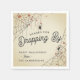 Spooky Halloween party napkin design features blood-spattered spider webs at the corners, with hanging spider and the words "Thanks for Dropping By." Customise with a message and name beneath.
