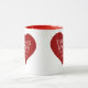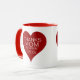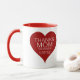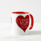 A mug with a lovely THANKS MOM FOR HAVING ME. I LOVE YOU! typography in white letters on a red heart on both sides of the mug.